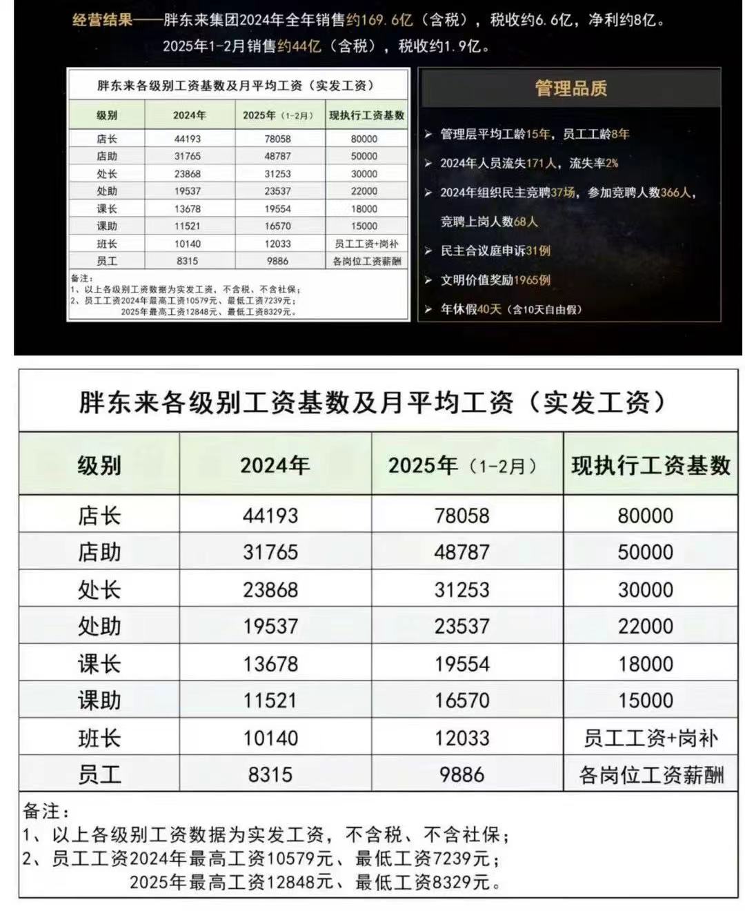 而在更早的3月28日,于东来曾在“2025中国超市周”演讲 PPT 中,展示了胖东来各级别员工工资表,工资表显示胖东来有店长、店助、员工等八个级别。2025年1至2月份,在交完社保以后,胖东来员工工资是9886元,店长平均月薪78058元,高管层工资普遍上调。