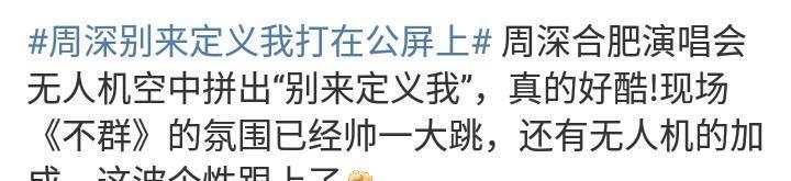 在这个越来越冷的冬天,充满温馨的事情,总是让人感觉暖意融融!周深在安徽合肥举行个人演唱会,带来打动人心的结果。值得一提的是,在周深合肥演唱会现场,还出现了无人机表演。清晰可见的是,在周深合肥演唱会的天空中,“别来定义我”五个字,如同星星般闪耀,令人眼前一亮!