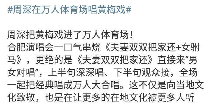 周深合肥演唱会好精彩!周深在万人体育场唱黄梅戏,体现优秀歌手深厚的唱功!周深演唱一首《夫妻双双把家还》,引发现场歌迷呼应!