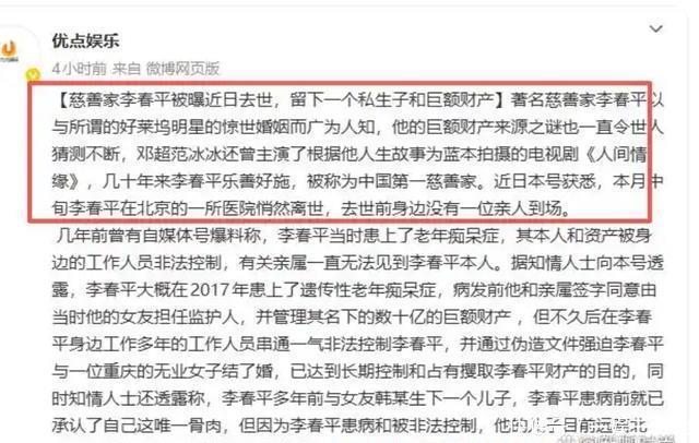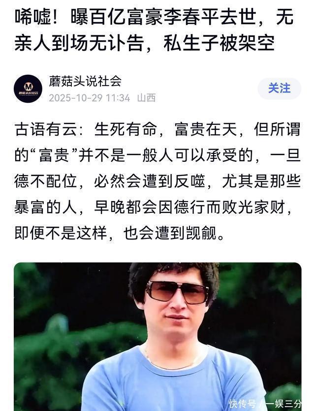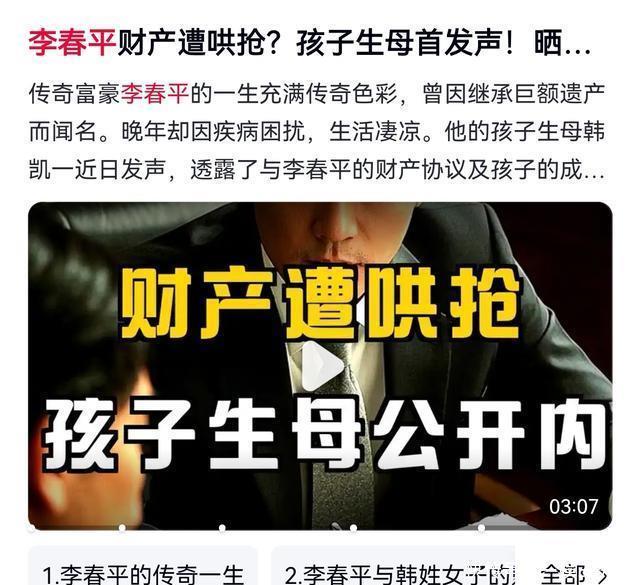 从保姆到亿万富豪,守诺半生却遭资产侵吞,是因果循环还是没参透鬼谷子的人性局? 近日,娱乐博主“优点娱乐”曝出李春平去世的消息,并透露李春平生前和韩姓女子育有一子,且人签署过财产协议:若李春平死后财产尽归孩子所有。如今财产却悉数被保姆控制了。这就奇怪了?他为什么不光明正大的结婚?让法律保护自己的巨额资产呢?这里有一个给世人提示的惊醒大瓜。