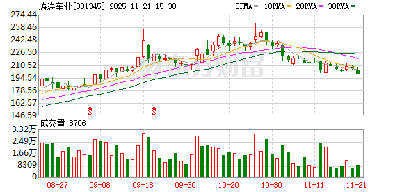 证券时报·数据宝统计,截至发稿,涛涛车业收盘价为199.22元,下跌3.39%,本期筹码集中以来股价累计下跌6.69%。具体到各交易日,3次上涨,6次下跌。