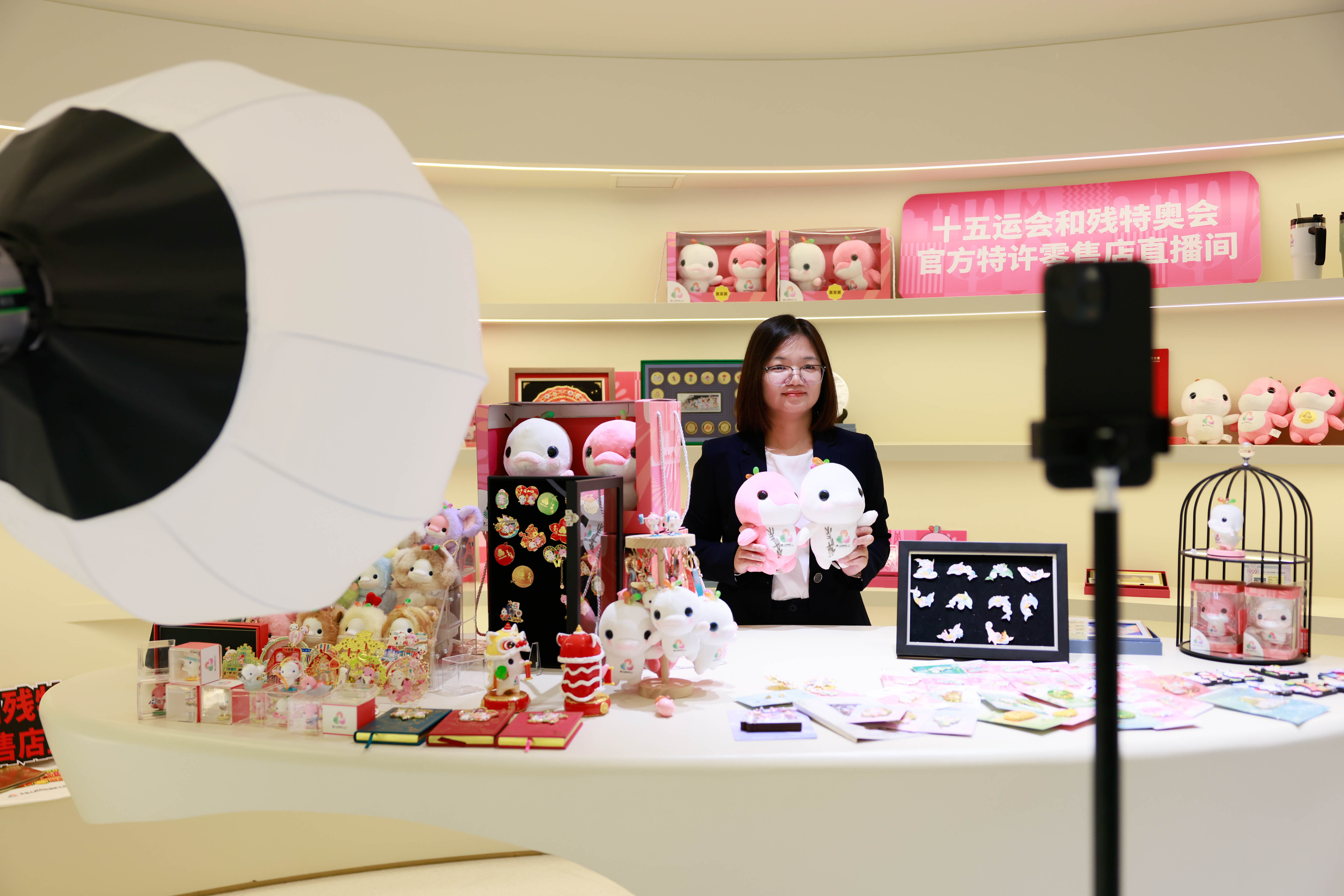 中山恒泰特许商品展厅正在直播售卖十五运会吉祥物。卢子衡 摄