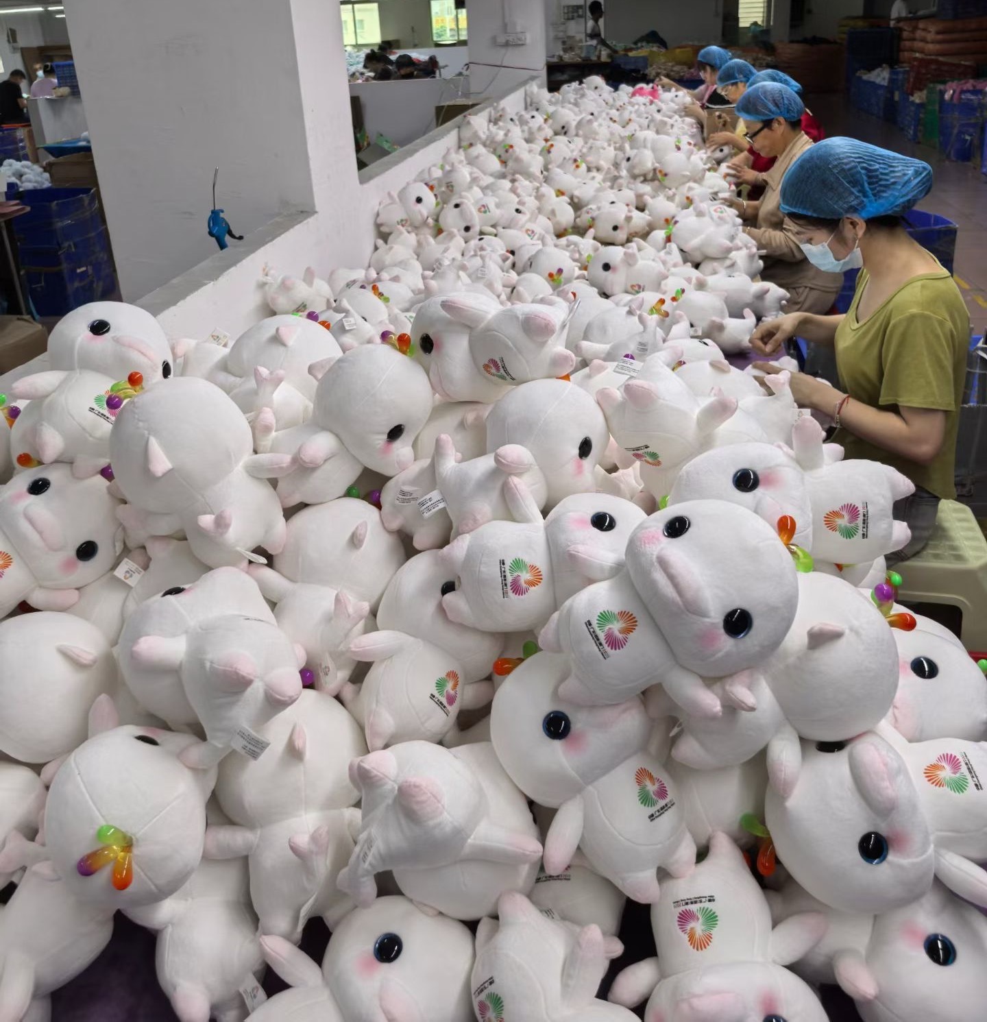数月前,踏入中山恒泰的工厂内,工人们忙于赶工。从缝合裁片到填充整型,他们精益求精,力求完美呈现中华白海豚的灵动神韵。畅销的“喜洋洋”“乐融融”毛绒公仔在工厂被堆成小山。