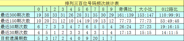 百位号码:前50期走势活跃的号码为:1、5开出7个,0、6开出6个;走势最冷的号码为:2、3开出3个,4、9开出4个。奖号012路比开出19:16:15,奇偶比开出26:24。本期百位杀排除:7、8,注意号码0、1、4,胆码参考1。