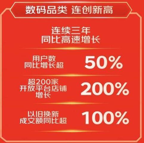 从京东发布的数据来看,数码品类的用户规模同比增长超过 50%,同时有超过 200 家开放平台店铺成交额同比增长 200%,以旧换新成交额同比增长也超过 100%。可以说,在 3C 数码品类里,京东依然稳居线上平台的中坚生态位,这也让他们的战报比以往更有参考价值。