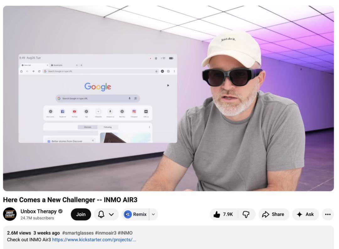 比如说,在一体式AI+AR智能眼镜路线里,INMO AIR3就是非常典型的代表。它不是简单的显示终端,而是一款搭载自研IMOS 3.0空间操作系统的一体式AI+AR智能眼镜:支持AI语义交互、空间计算、多屏协同等能力,用户可以在眼前完成信息调用、应用切换,而不再只是“看视频”“投个屏”这么简单。