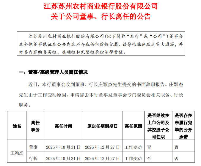 11月4日,苏农银行发布公告称,由于工作变动原因,庄颖杰申请辞去该行行长等职务。
