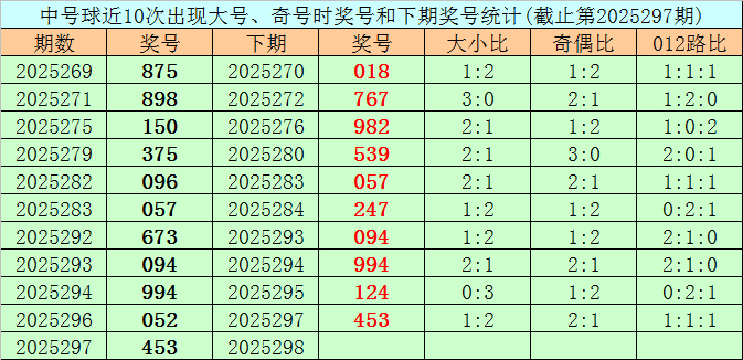 在中号球前10次开出大号、奇号类型之后,其下期分别开出奖号:018、767、982、539、057、247、094、994、124、453,其中号码奇偶比为6:4,大小比为6:4,012路比为4:2:4。
