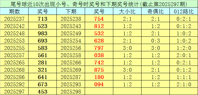 在尾号球前10次开出小 号、奇号类型之后,其下期分别开出奖号:754、812、532、628、797、038、742、875、180、094,其中号码大小比为4:6,012路比为1:3:6,奇偶比为2:8。