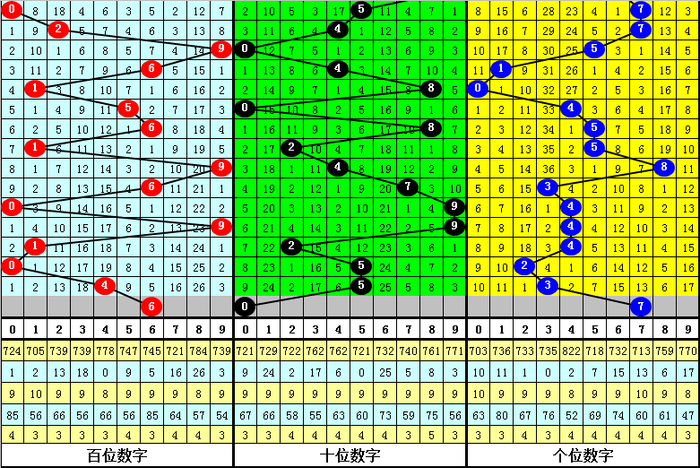 尾号球:上期奖号为3,开出小 号、奇号,该位前10次开出小 号、奇号的现象时其奖号分别为:713、523、983、693、583、561、281、321、641、673,其中尾号球012路比为6:4:0。